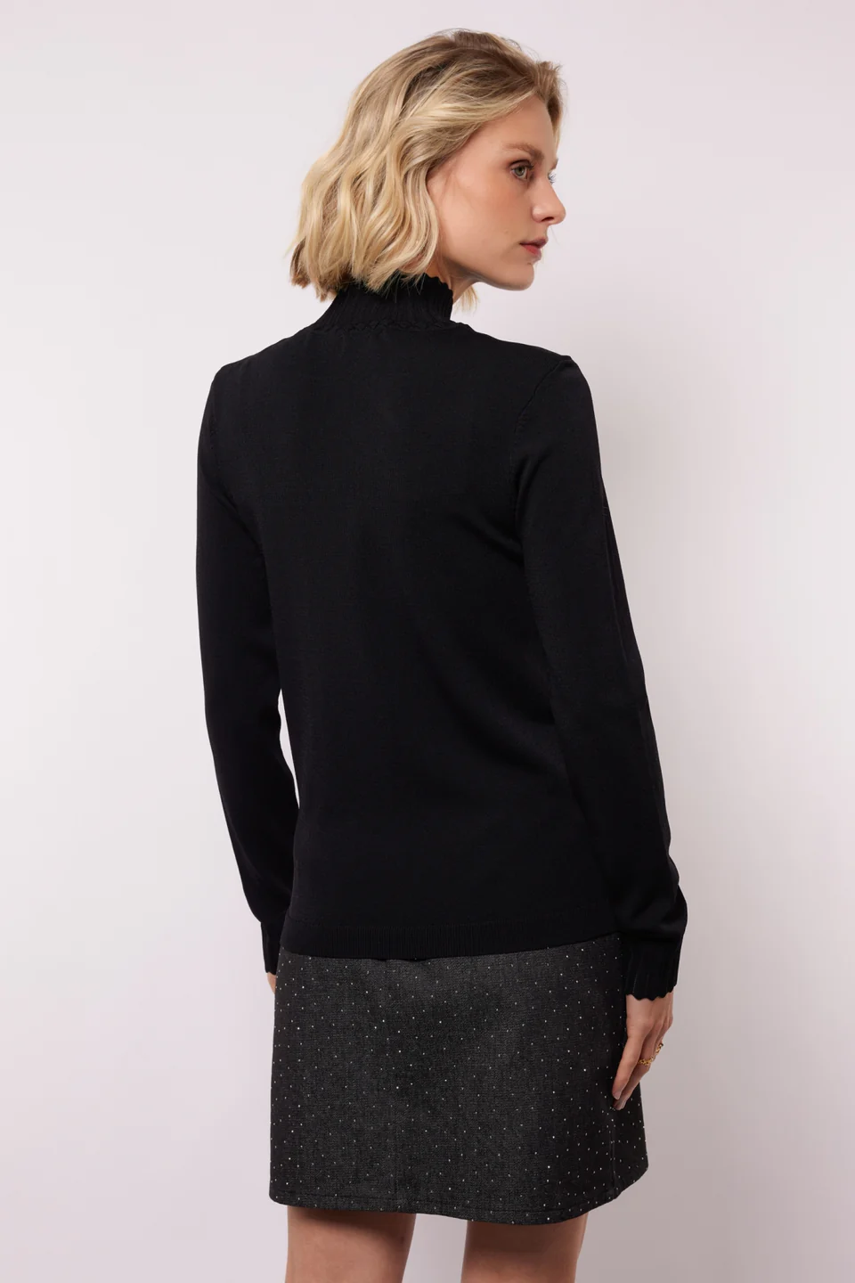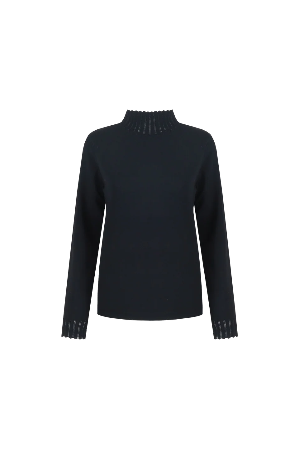Classy knit alert! De CALYX KNIT SWEATER is een fijngebreide top met subtiele details: een ribkraag, ajour afwerking aan de boorden en een zachte, stretchy stof. Color Black